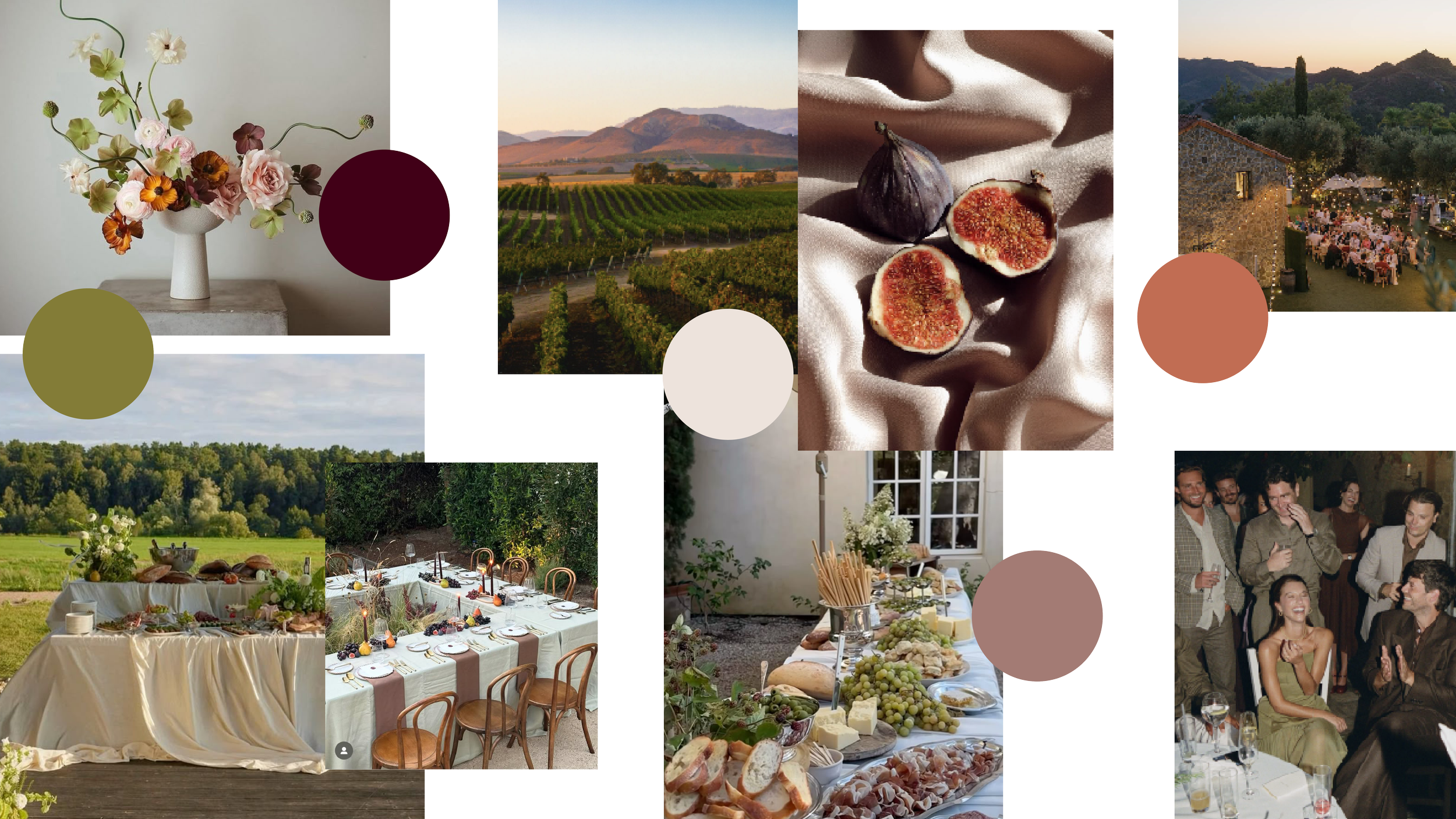 A note on wardrobeThe wedding will be semi-formal, and take place outside, surrounded by vineyards during harvest time, when grapes and figs are in season. The natural environment invites a dress code that’s warm, polished and relaxed, with flowing fabrics and elevated details. Feel free to take inspiration from the color palette and textures of our moodboard. We look forward to seeing you!